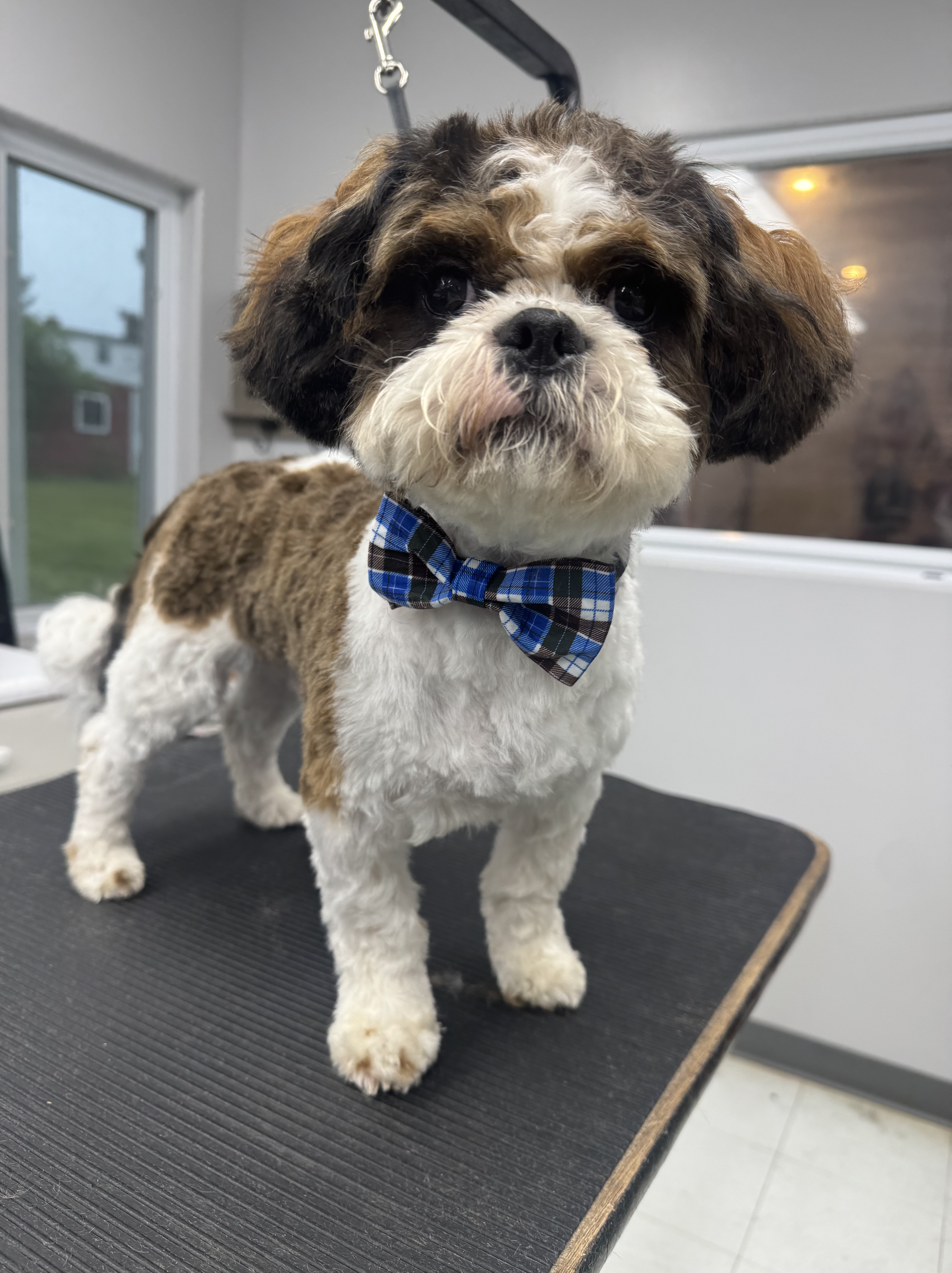 Full body haircut with length taken off all over finished with styling. Fit for breeds such as Shih Tzus, Poodles, Doodles, Maltese, Yorkies, Havanese, Bichons, and other curly and/or long flowing hair breeds.